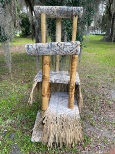 It’s Tiki Time!! Woven grass skirting gives extra interest to this not-so-rustic tree. LONG tall debarked branches support a cradle up on high, with an additional cradle and two more platforms below. Long sisal scratching area right up on top.