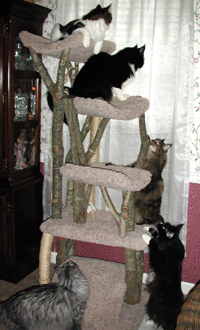The next day, Steve set out on a mission. He went to an area where he knew there had just been some hardwood trees bulldozed for building purposes. He took his chainsaw and cut some of the nicest wood he was able to find. He then went to Dalton and found some beautifully colored, thick carpet. Next, he took his supplies down to his basement where, always having been rather handy, Steve had a full workshop laid out. He hammered, sawed, nailed, sanded, bunched, gathered and stapled until he had a rough prototype of what promised to be a beautiful cat tree - one anyone would be proud to display in the living room!